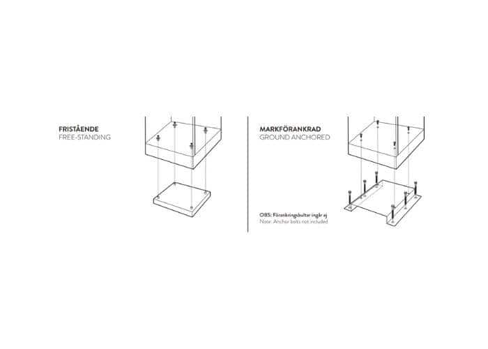 Perustustapa: Vapaasti seisova (betonijalusta) tai pultattava